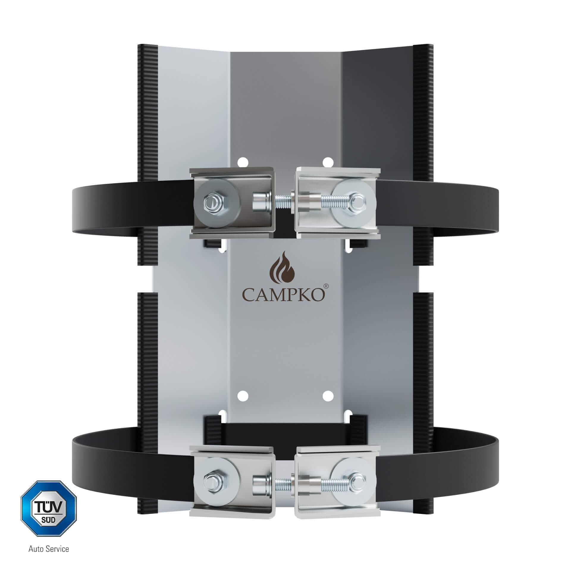 Montážní deska a upínací pásy jsou vyrobeny z vysoce kvalitní nerezové oceli, což zaručuje dlouhou životnost, odolnost proti korozi a zároveň pevnost potřebnou pro bezpečný provoz. Díky své konstrukci je držák vhodný nejen pro běžné výměnné plynové láhve, ale i pro plnitelné hliníkové láhve CAMPKO, což z něj činí univerzální řešení pro mnoho typů užití – od rekreačního využití až po průmyslové aplikace.