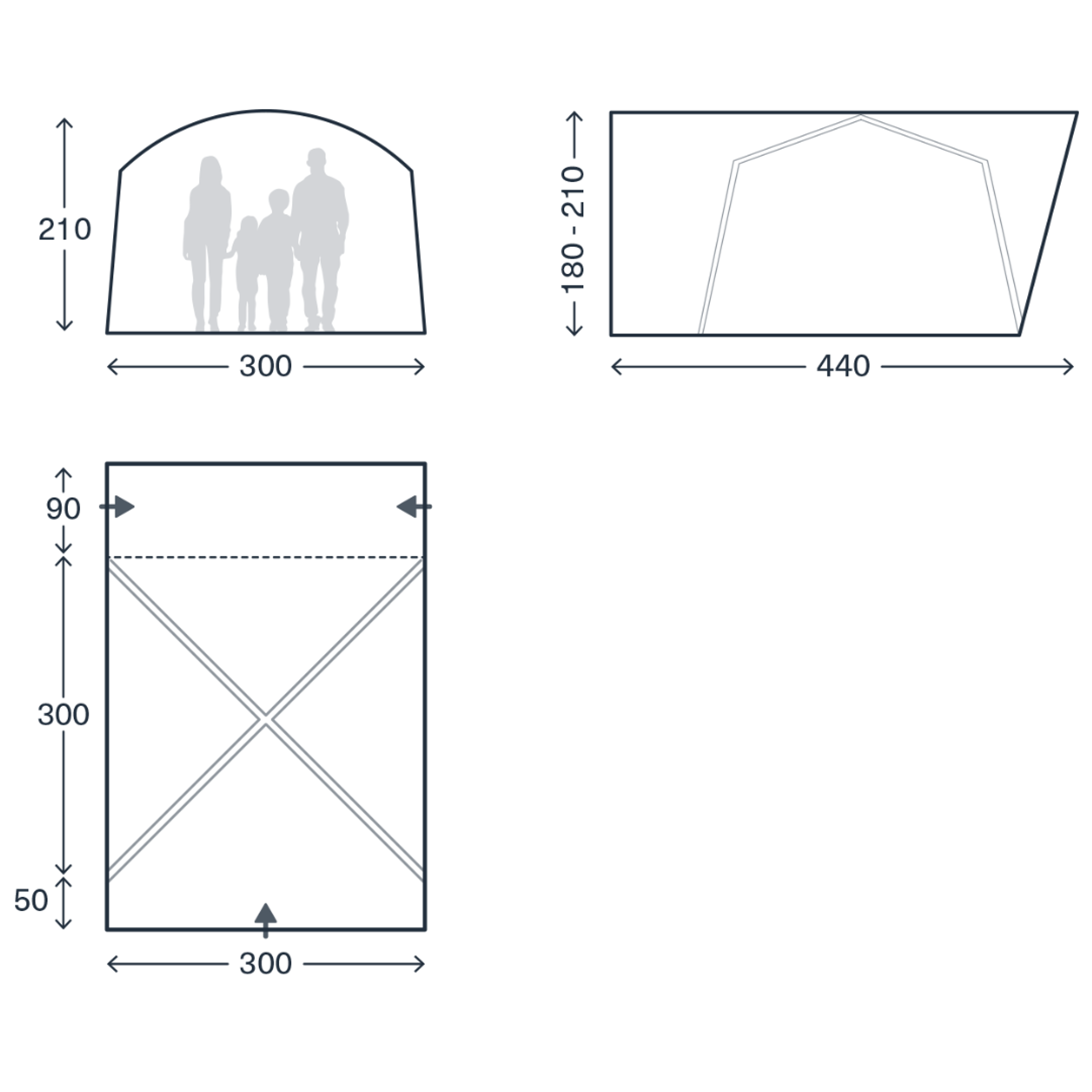 Velkorysý vnitřní prostor o rozměrech 300 × 300 cm a výškou 210 cm poskytuje dostatek místa pro relaxaci, vaření i přespání. Integrovaná všitá podlážka chrání před vlhkostí, chladem i nečistotami.