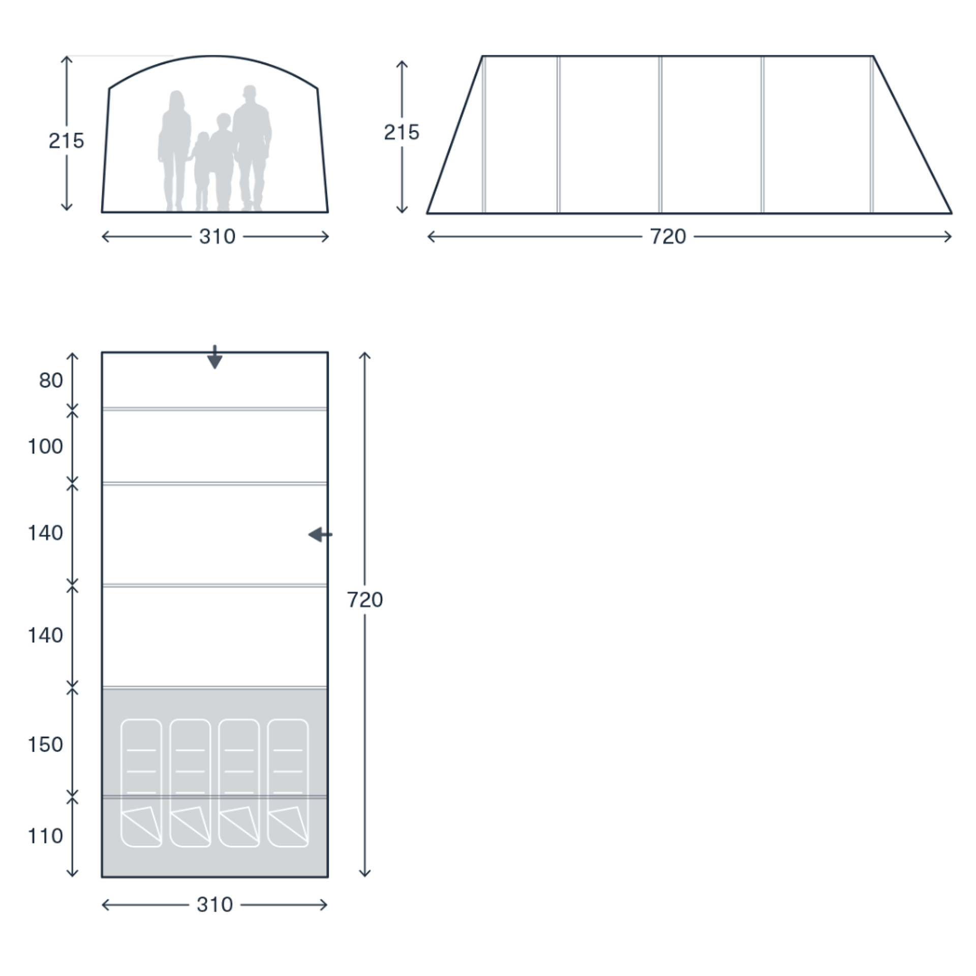 Stan má tunelovou konstrukci se stojnou výškou 215 cm, což zajišťuje pohodlný pohyb uvnitř. Celková délka činí 720 cm a šířka 310 cm, takže nabízí opravdu velkorysý prostor. Vnitřní uspořádání je rozděleno do tří hlavních zón: přední přístřešek (canopy), obytný prostor a ložnice.