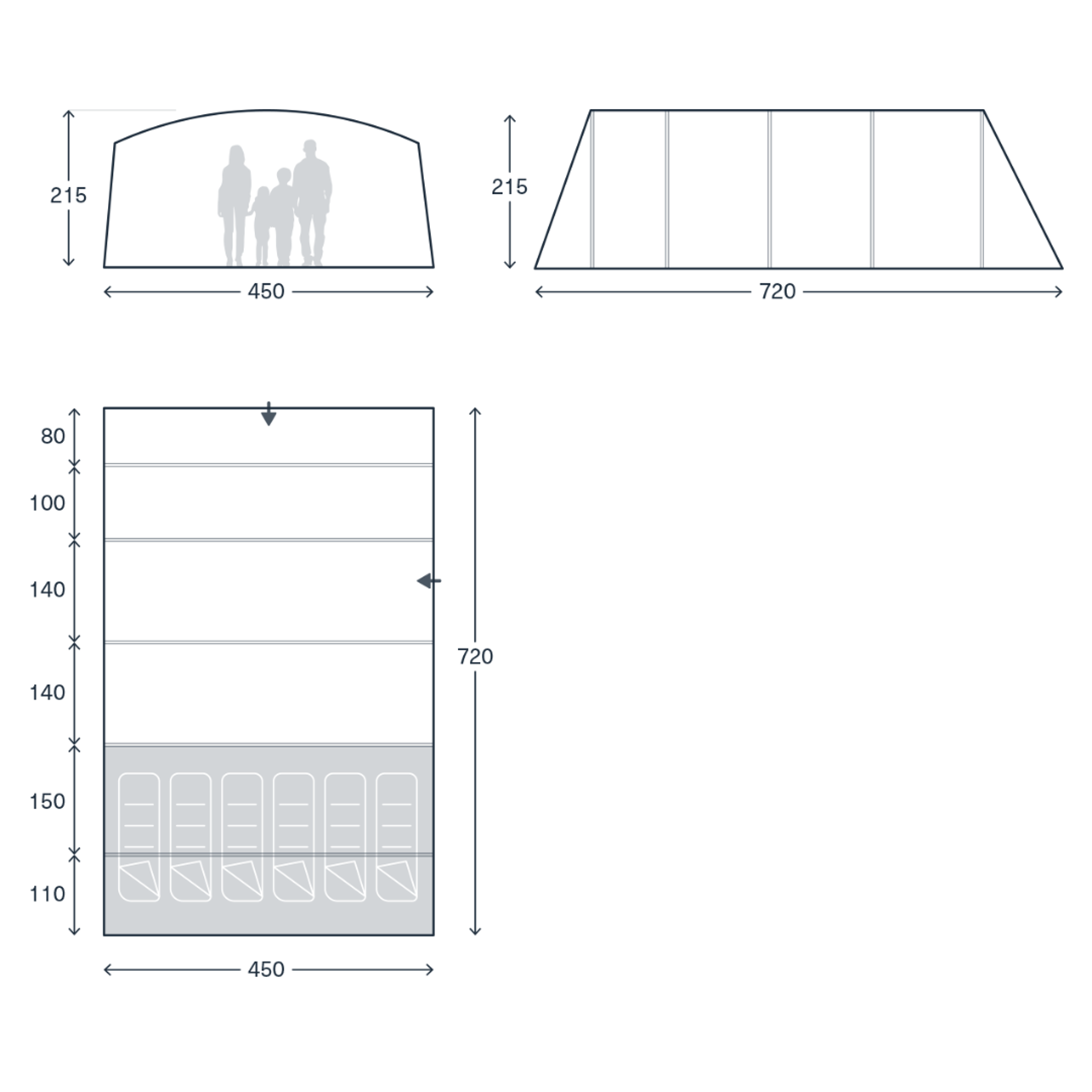 Díky rozměrům 720 × 450 × 215 cm (délka × šířka × výška) nabízí stan opravdu nadstandardní prostor. Tunelová konstrukce se stojnou výškou 215 cm umožňuje pohodlný pohyb po celé obytné části. Vnitřní uspořádání je rozděleno do tří zón: přední přístřešek (canopy), obytný prostor a ložnice.