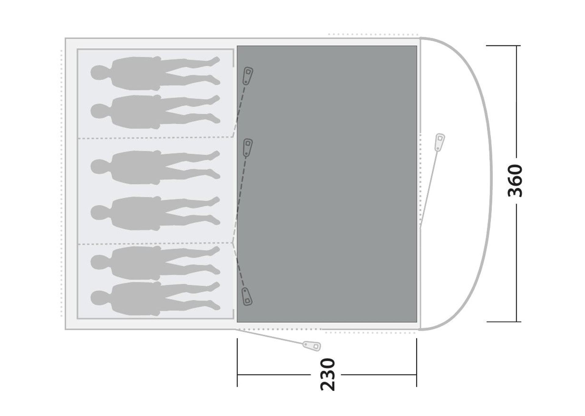 • Velikost: Velkorysé rozměry 230 x 360 cm, ideální pro komfortní kempování.