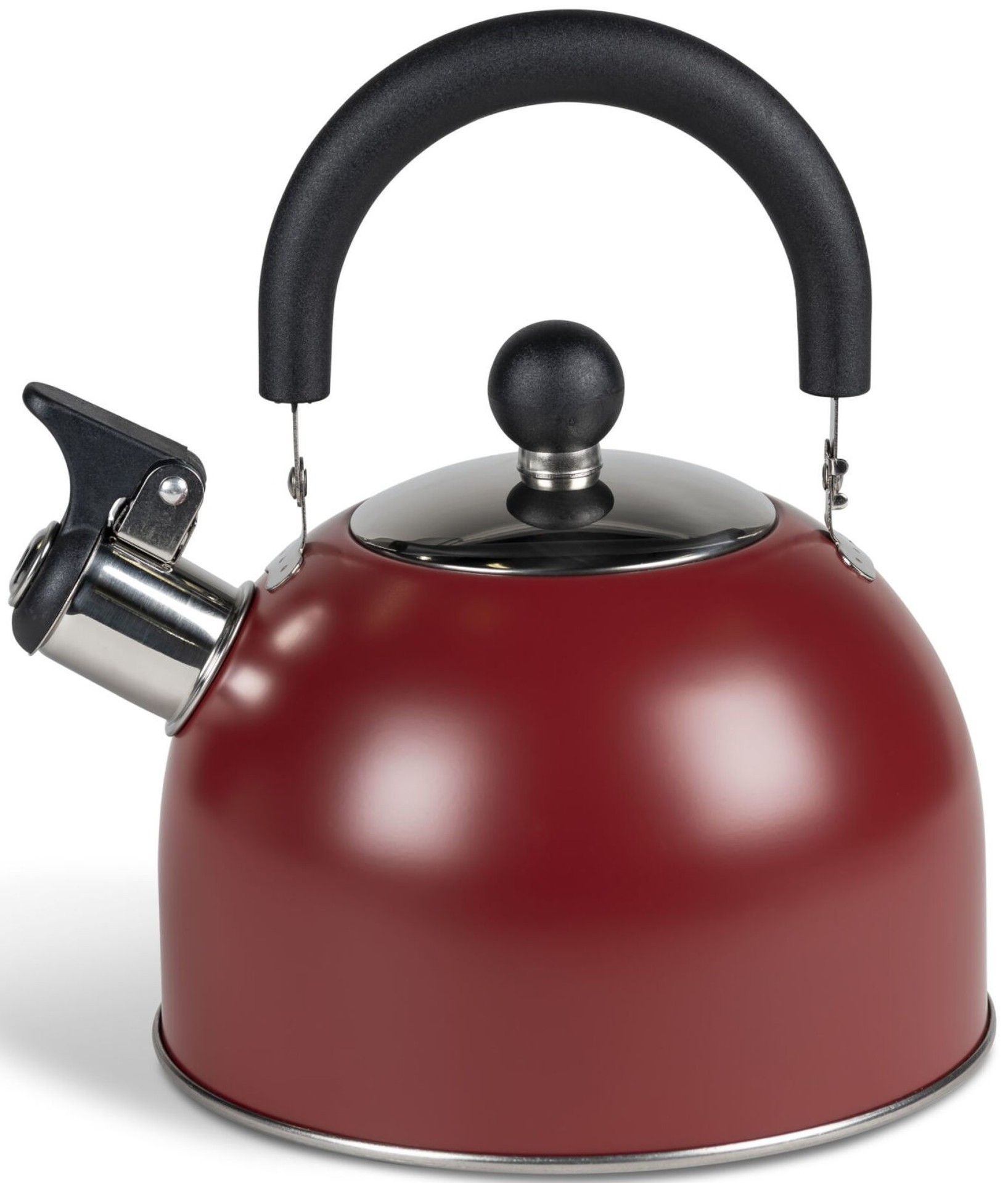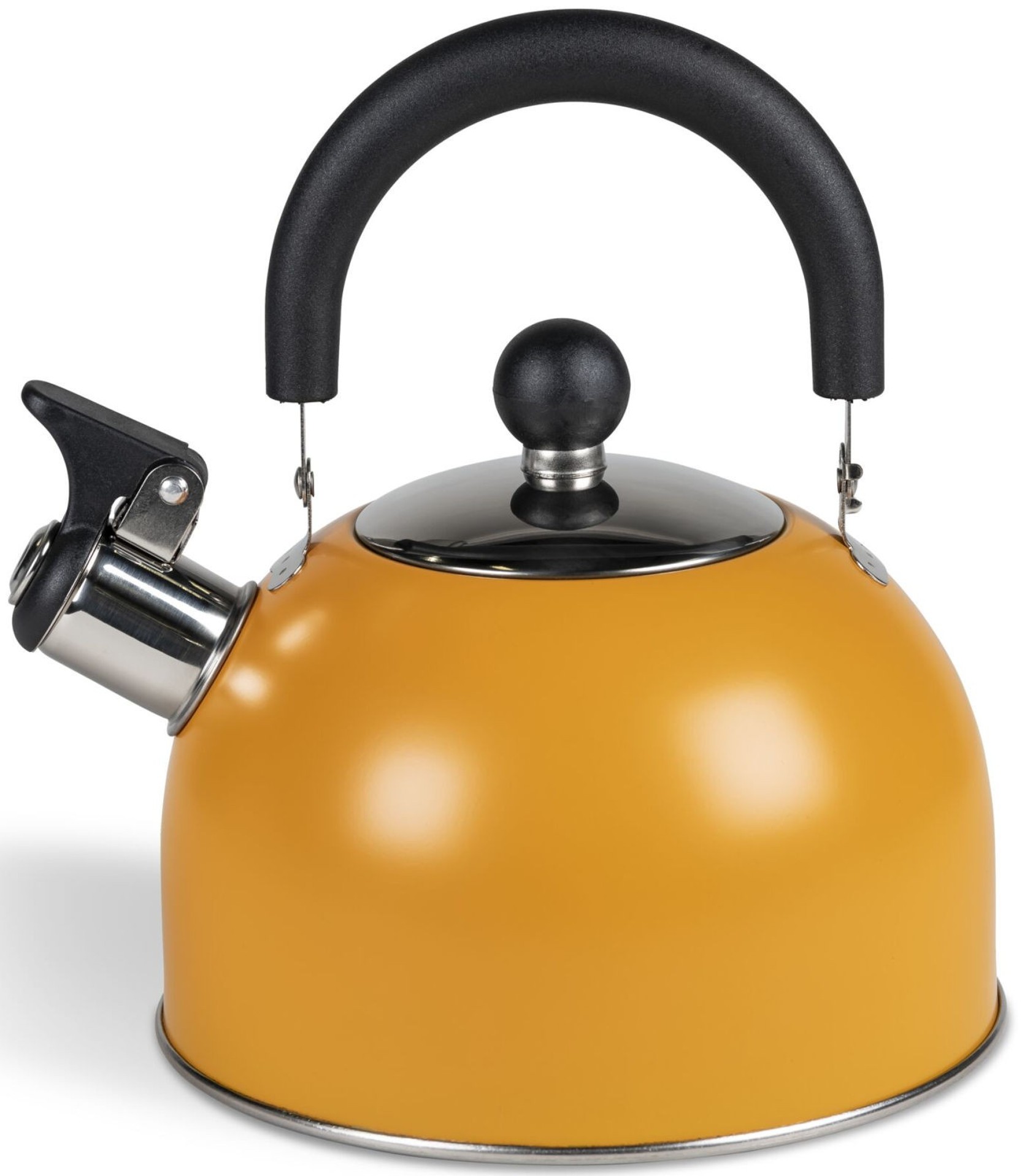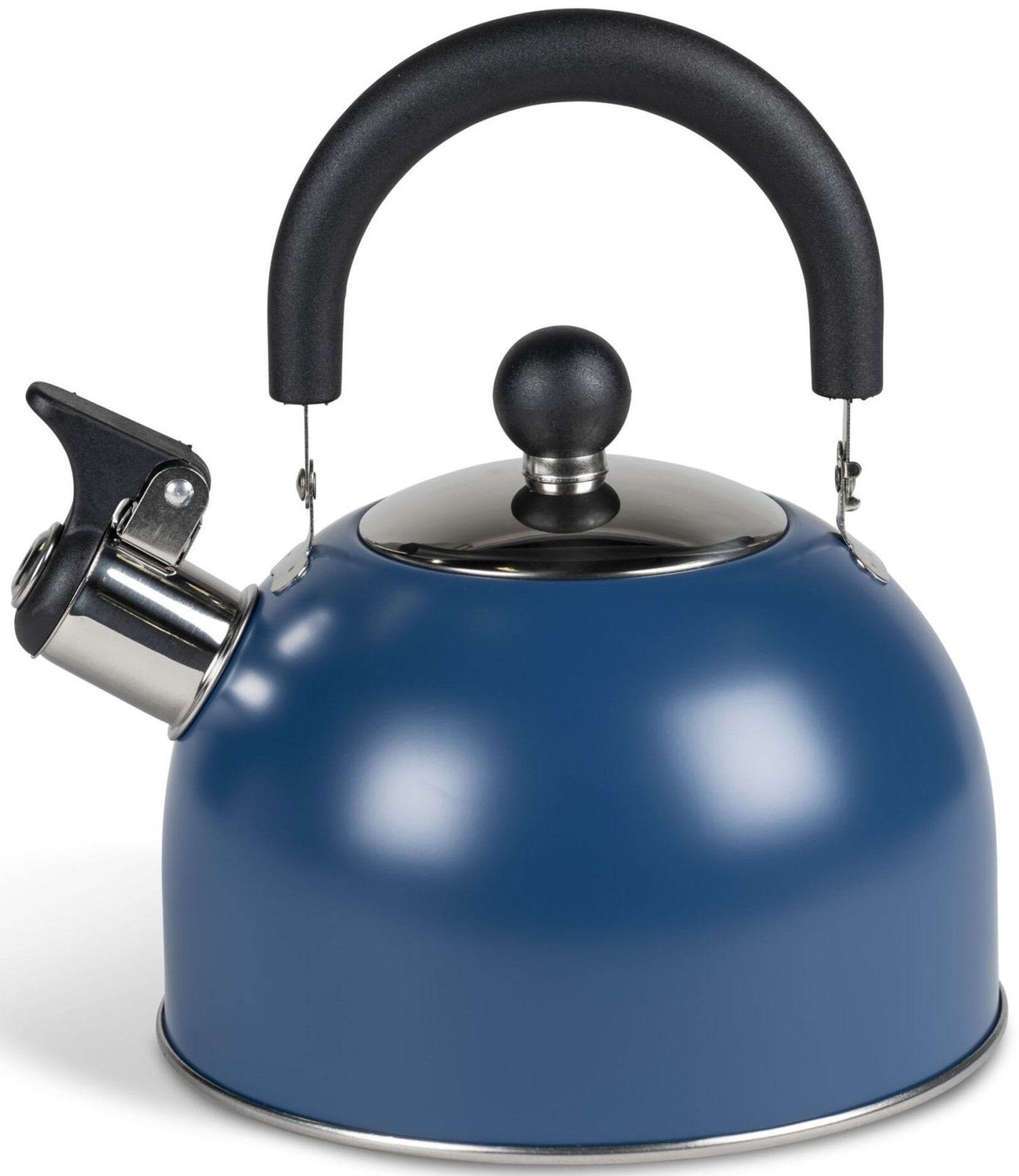 Lehká nerezová pískací konvice Kampa Brew o objemu 2 l ideální pro kempování, s praktickou sklopnou rukojetí a pískáním při varu vody.