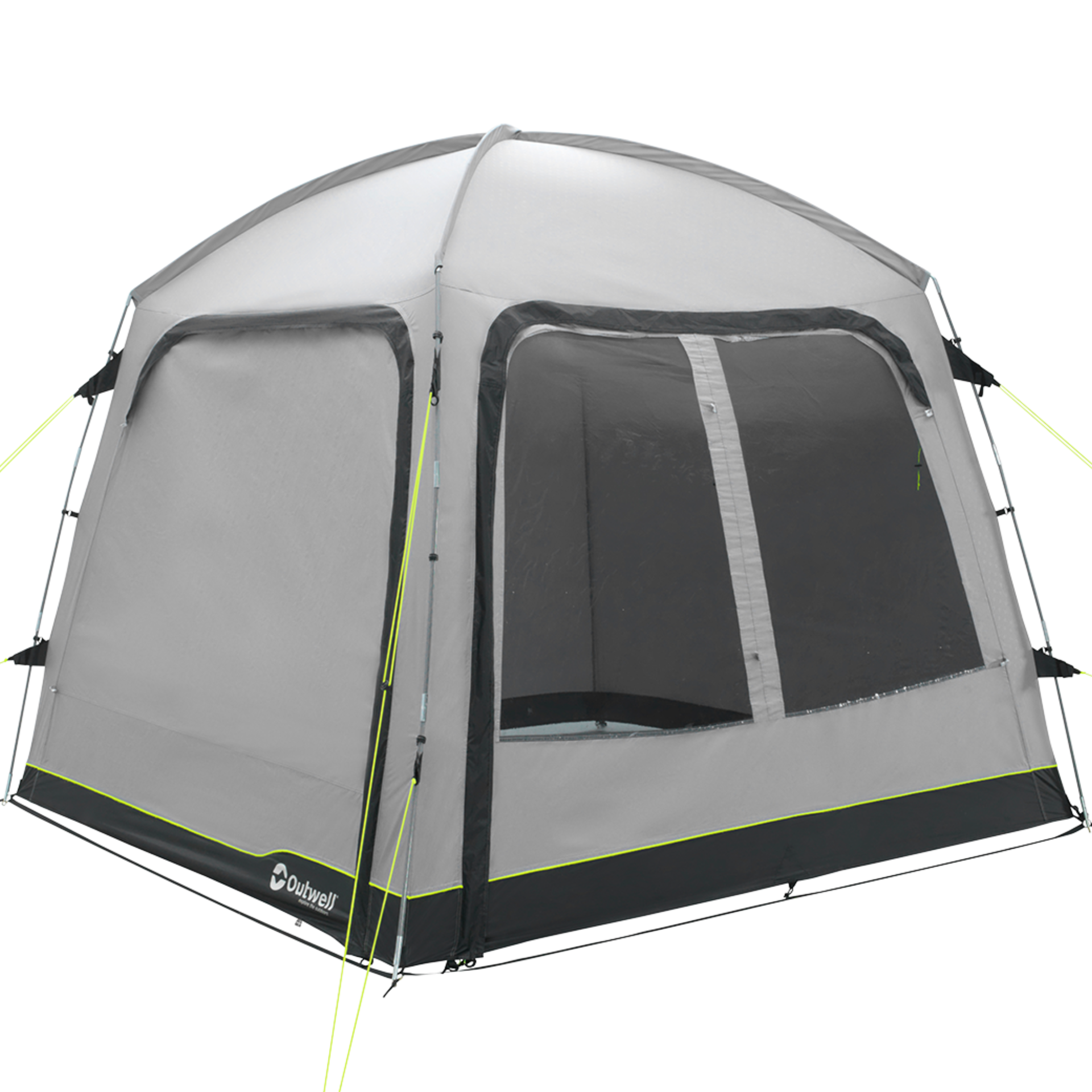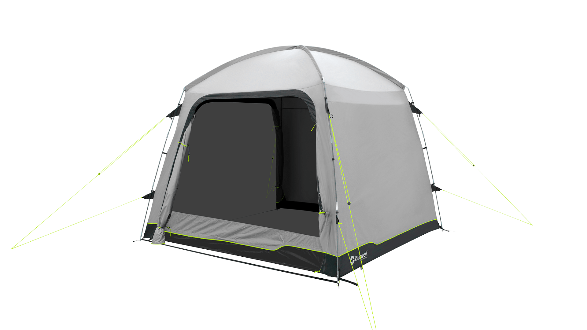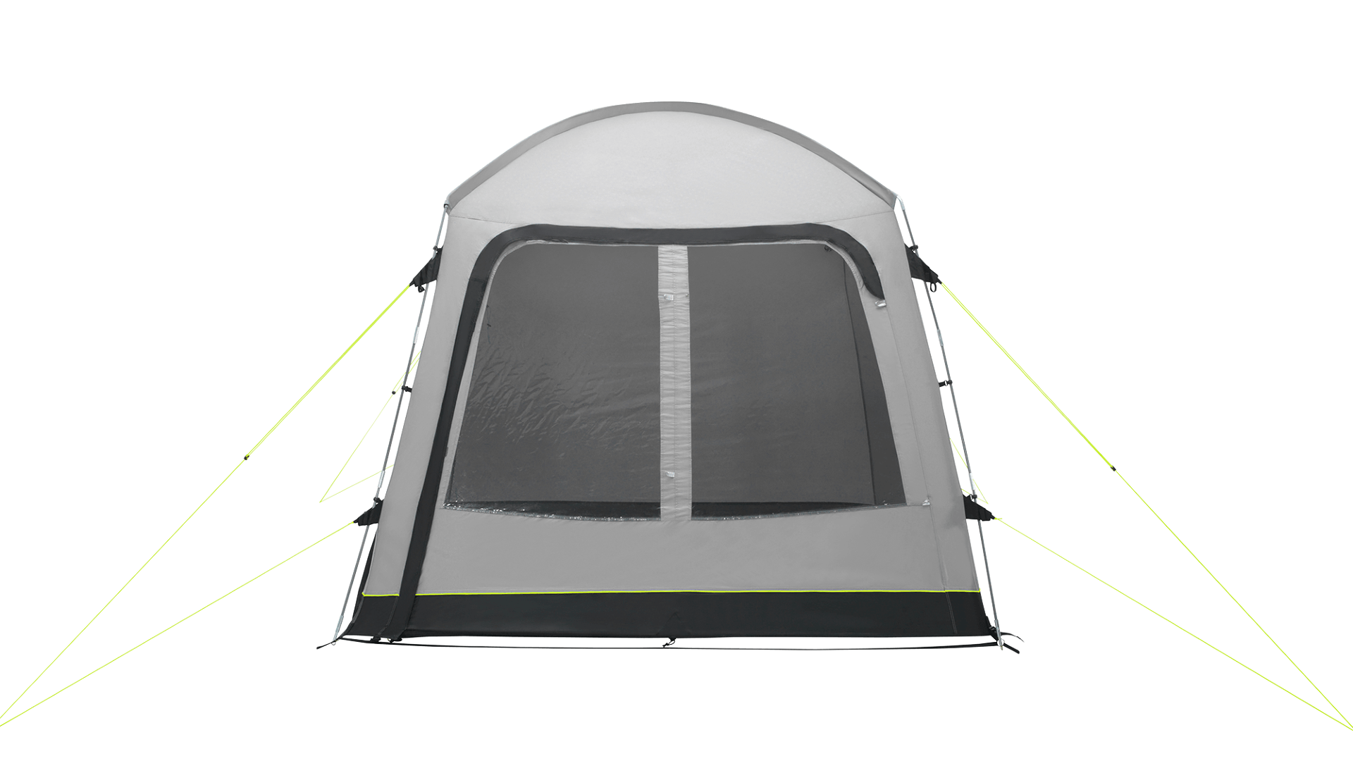 Přístřešek má dvě pevné stěny a dvě plně otevíratelné strany, což umožňuje flexibilní přizpůsobení prostoru podle aktuálních podmínek. Vstupní panel je vybaven látkovými dveřmi s plně síťovanými dveřmi za nimi, což zajišťuje ventilaci a ochranu proti hmyzu.