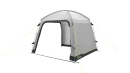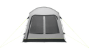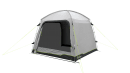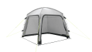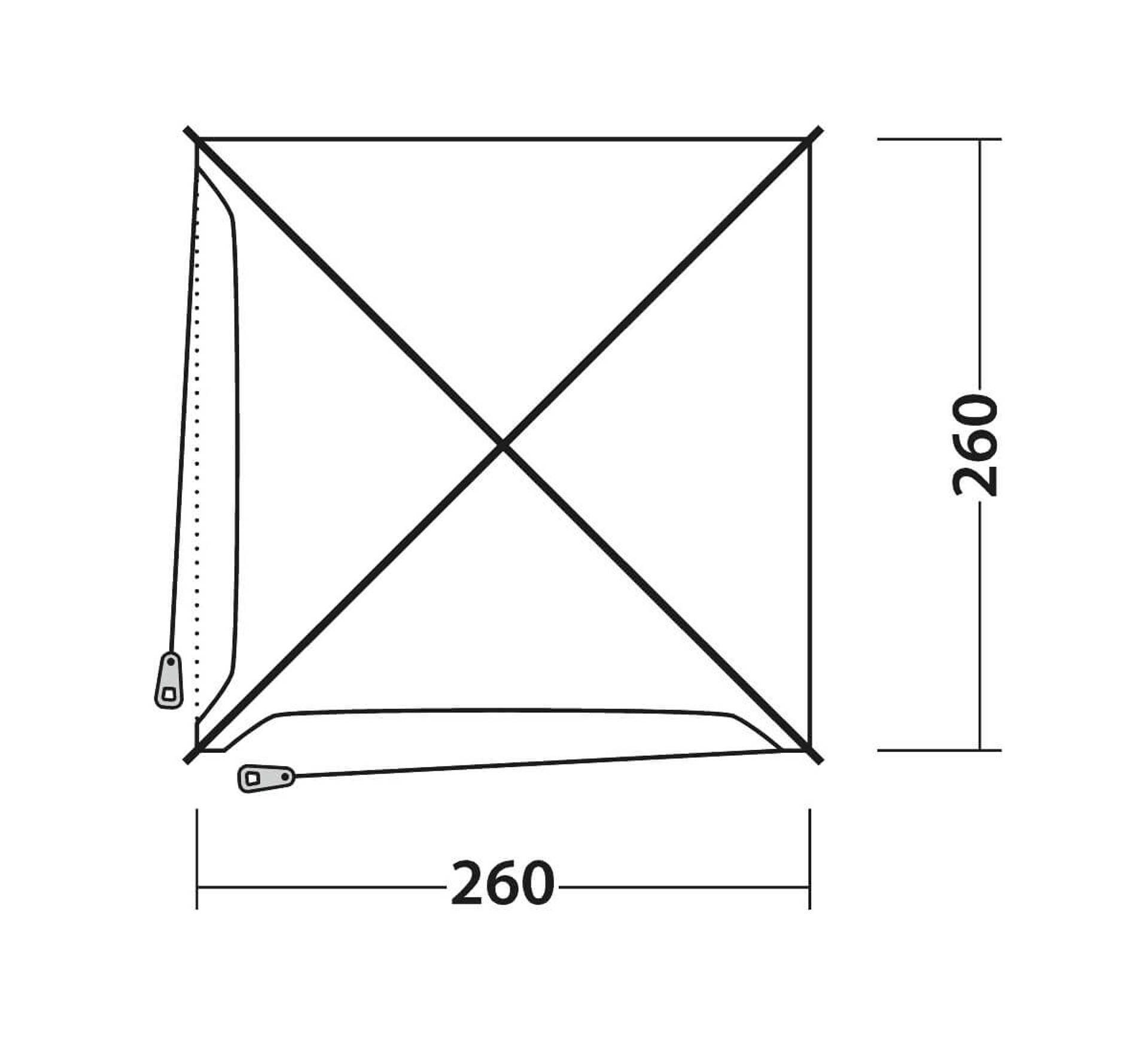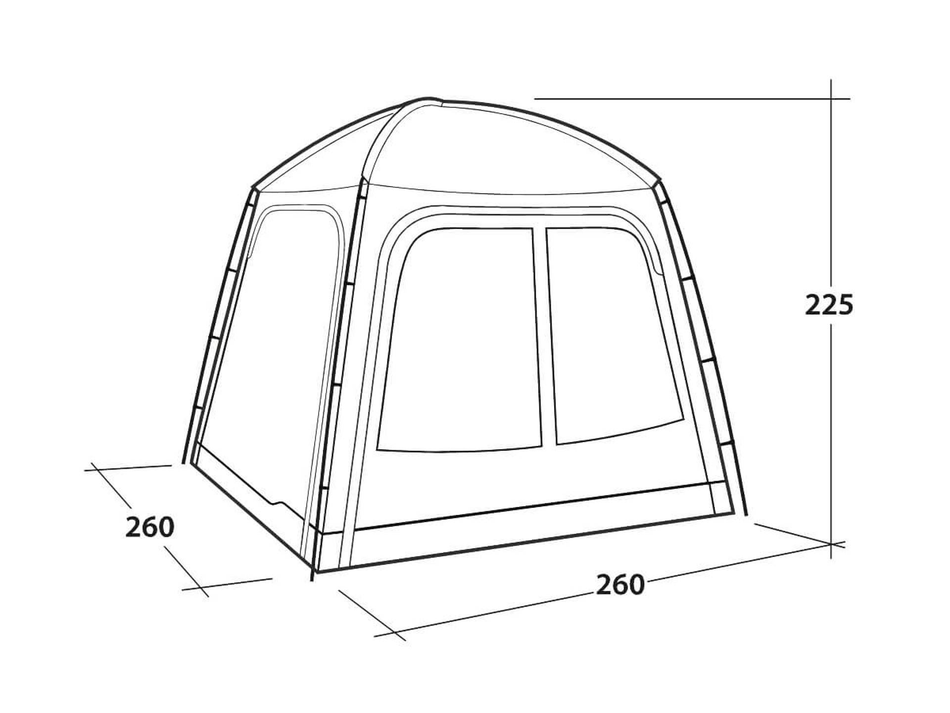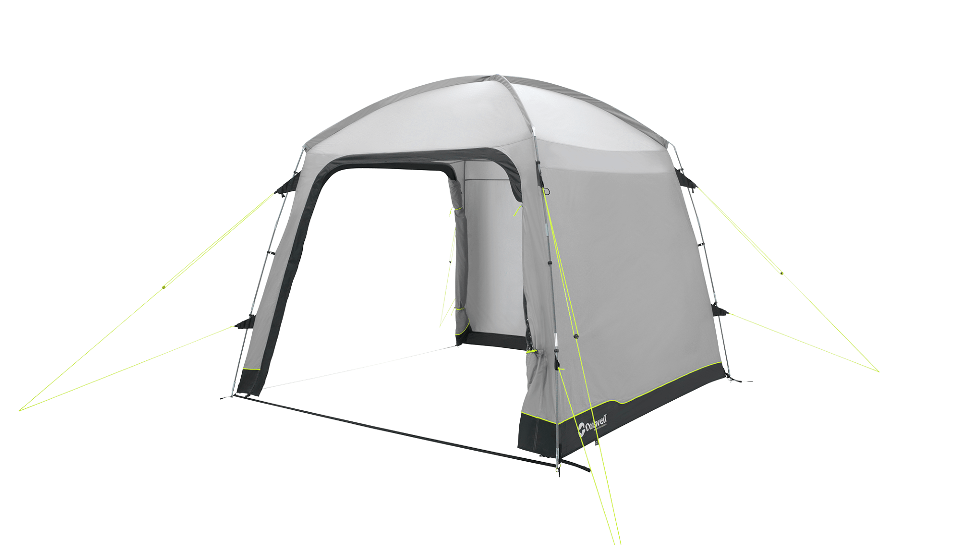 Přístřešek má dvě pevné stěny a dvě plně otevíratelné strany, což umožňuje flexibilní přizpůsobení prostoru podle aktuálních podmínek. Vstupní panel je vybaven látkovými dveřmi s plně síťovanými dveřmi za nimi, což zajišťuje ventilaci a ochranu proti hmyzu.