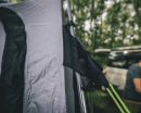 Velkým benefitem je také dostatečná výška vstupu a vnitřní prostor, který zajišťuje pohodlný pohyb uvnitř. Praktické detaily jako síťované úložné kapsy a závěsný bod na lucernu zvyšují komfort při používání.