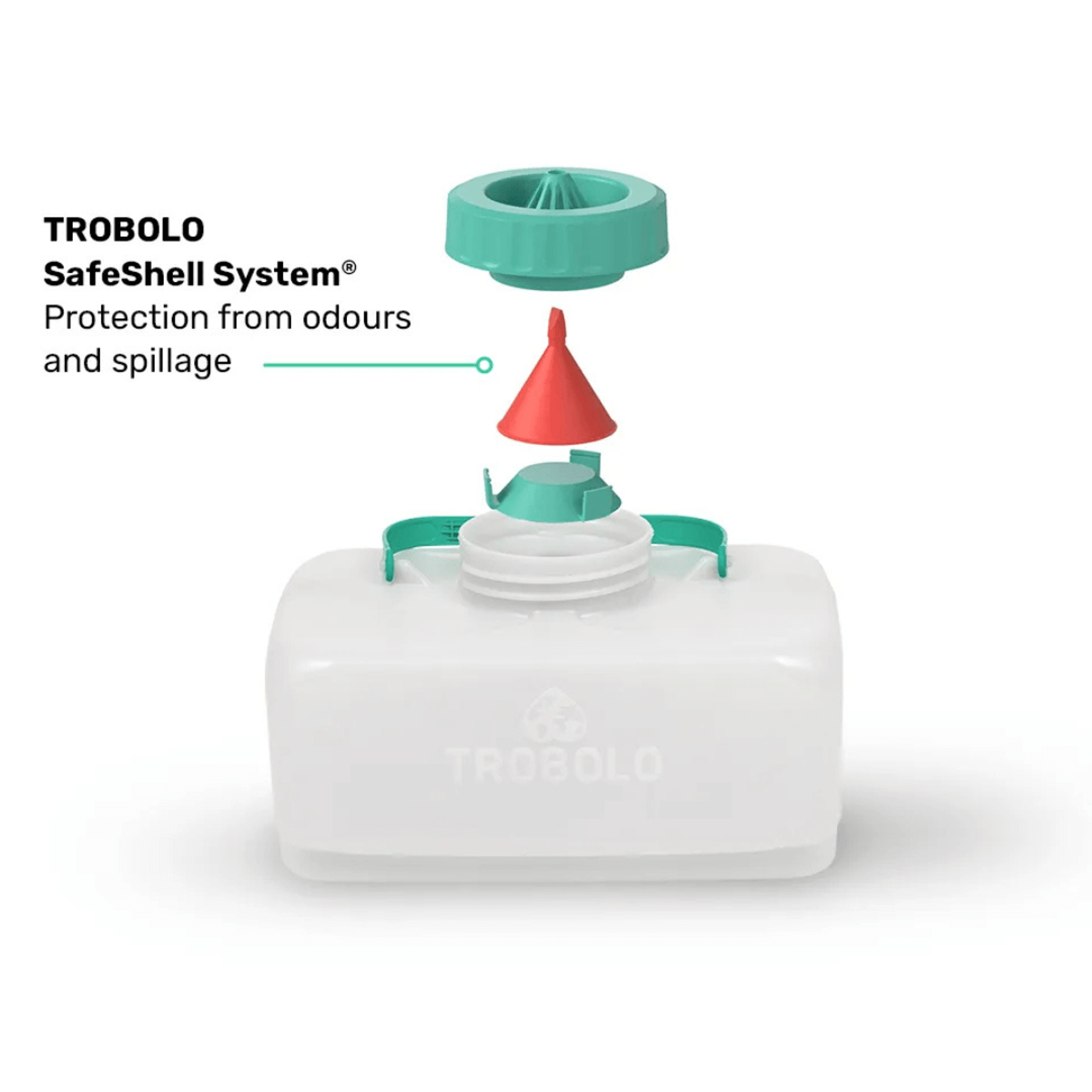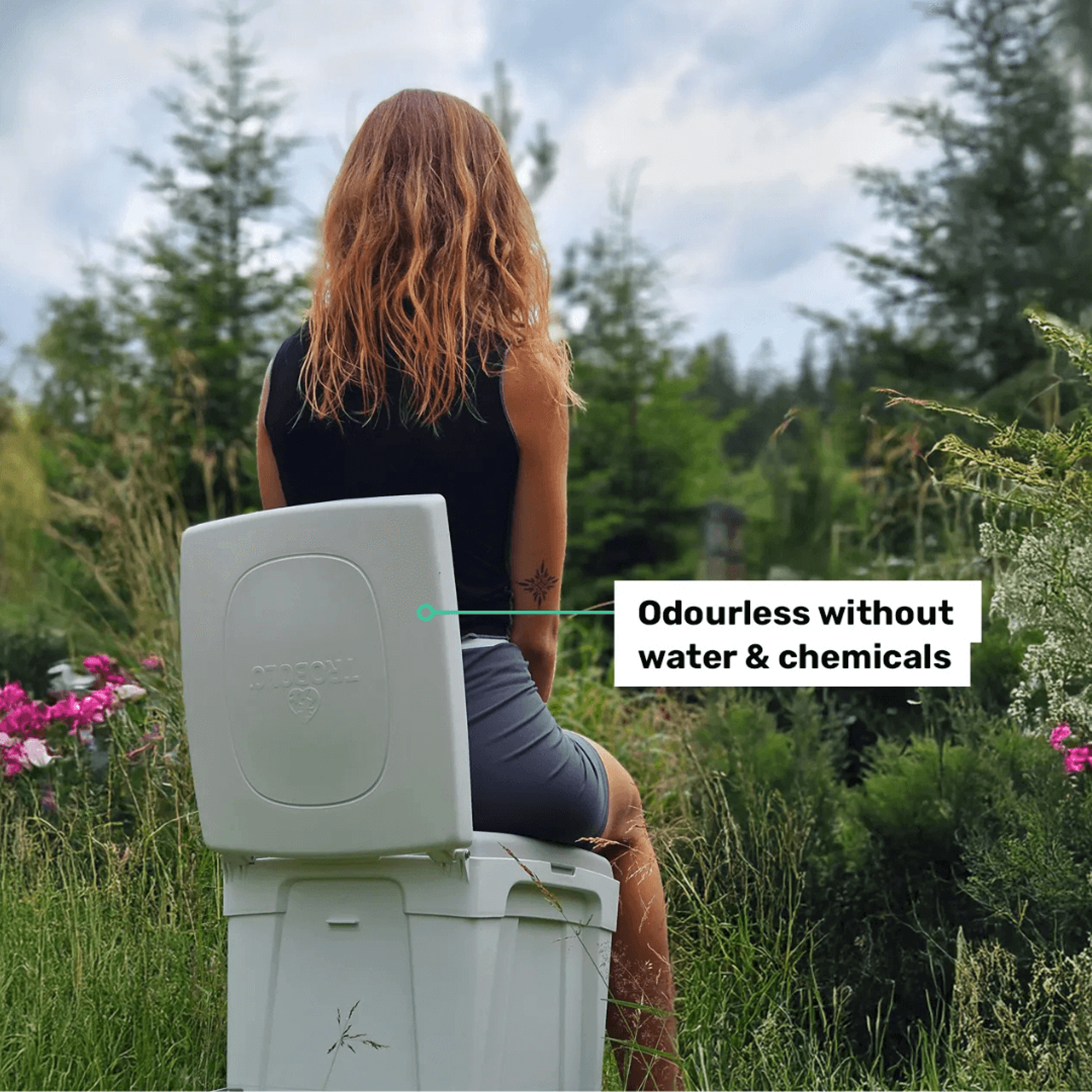 Tato mobilní toaleta funguje zcela bez vody, elektřiny a chemikálií. Díky tomu je ekologická, udržitelná a zcela soběstačná. Využívá oddělený systém sběru moči a pevných látek, který zajišťuje naprosto bez zápachu provoz. To je možné díky integrovanému separátoru moči a použití přírodního posypu spolu s patentovaným systémem TROBOLO SafeShell, který chrání nádržku na tekutiny proti rozlití i v náročných podmínkách při cestování.