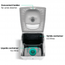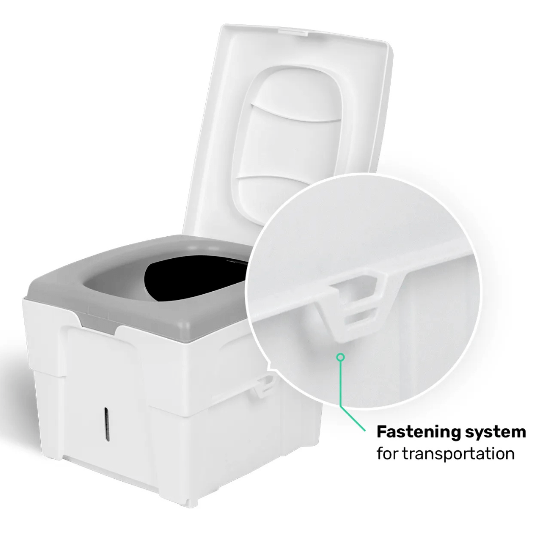 I přes své malé rozměry nabízí komfortní výšku sedu 293 mm a ergonomicky tvarované sedátko, takže se nemusíte obávat nepohodlí ani při častém používání. Díky pevně uzavíratelnému víku a systému uchycení pro přepravu zůstává obsah toalety bezpečně uzavřen i při přesunu vozidlem.