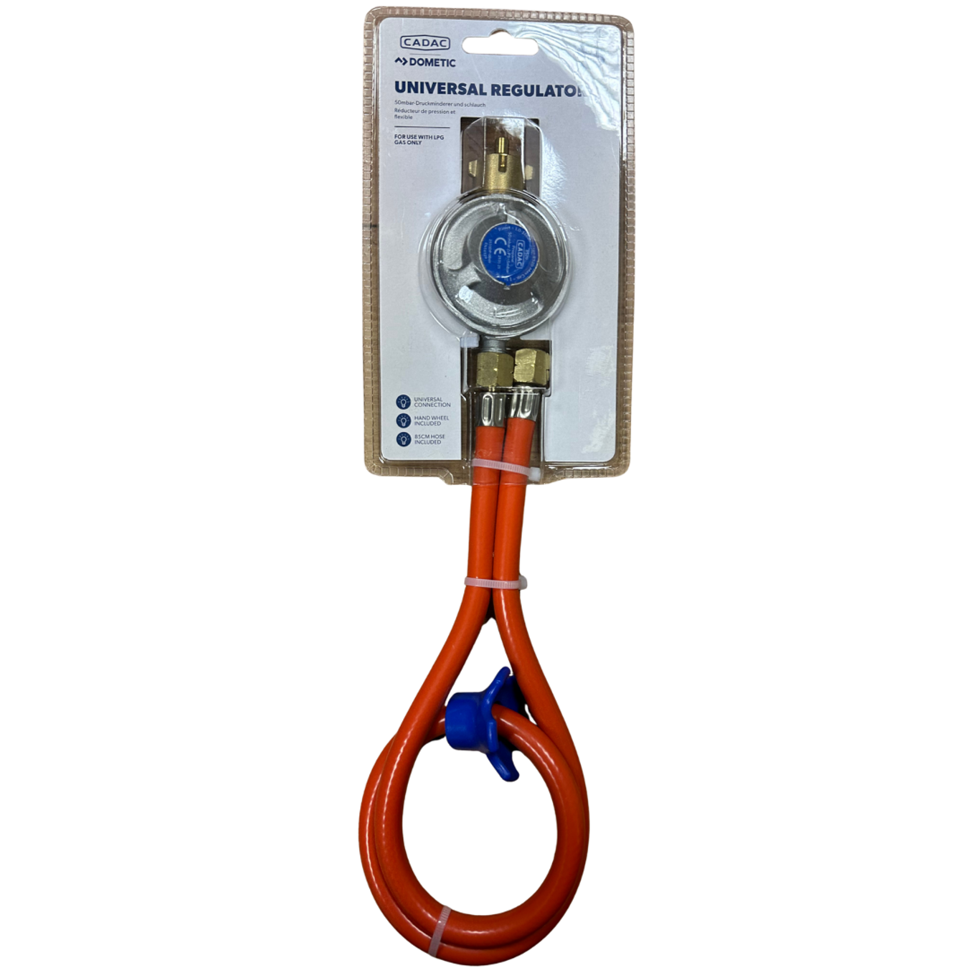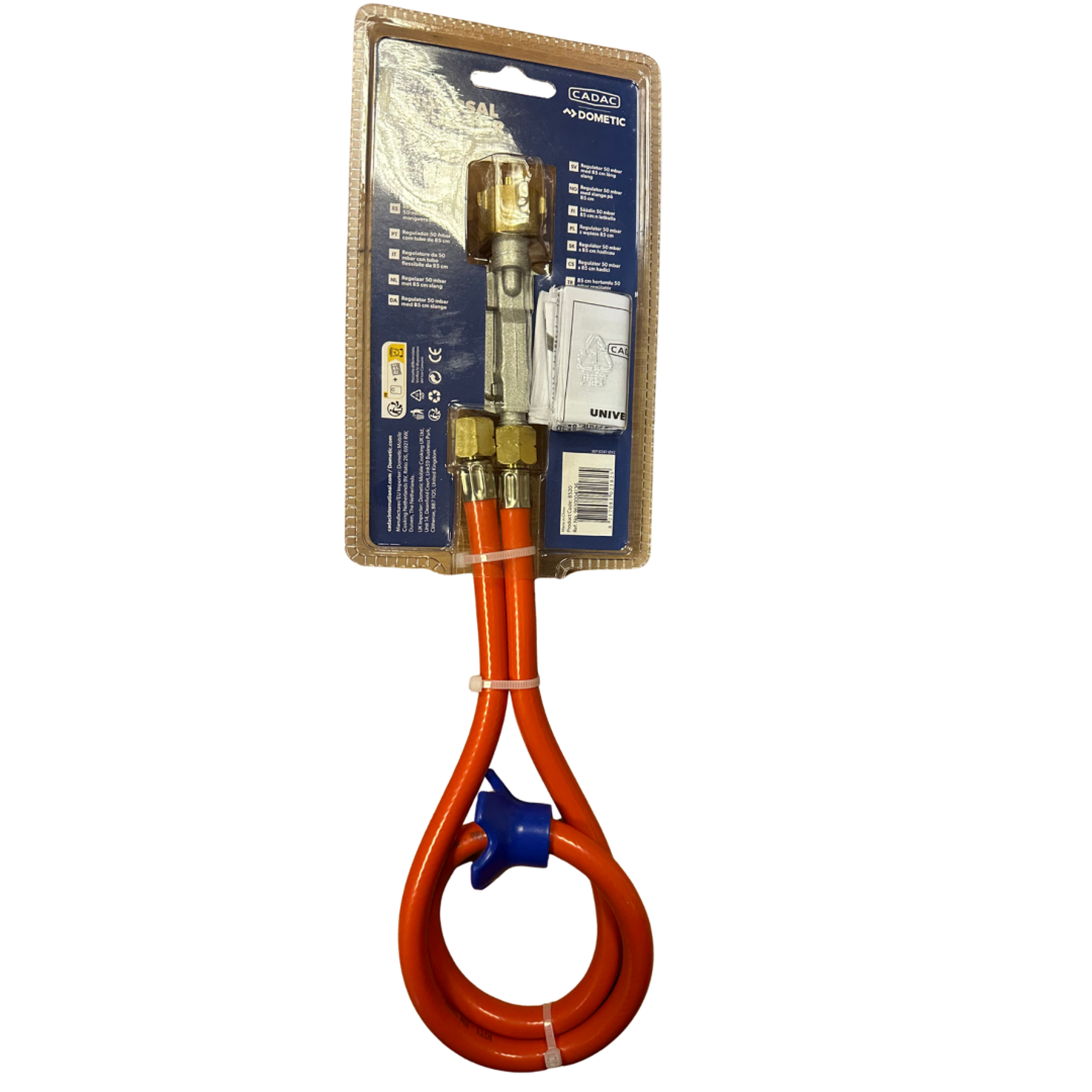 Připojovací sada s regulátorem Cadac 50mbaruniverzální připojení (vstup: ½" levý vnitřní závit, výstup: ¼" levý vnější závit), a je proto vhodná pro použití s univerzální, plnitelnou plynovou lahví.