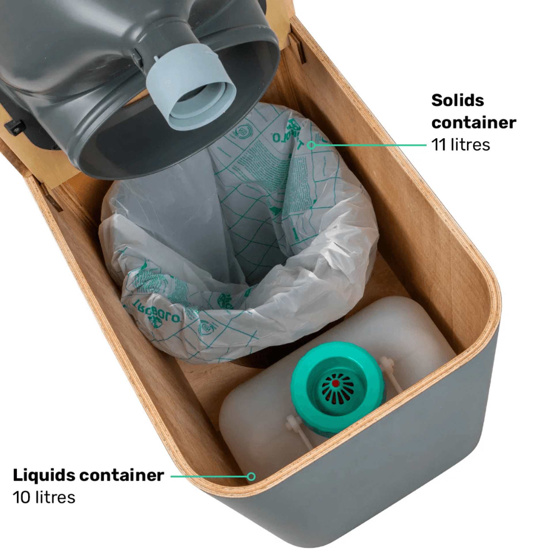 Objem nádoby na moč je 10 litrů, což vystačí na 30–50 použití, nádoba na tuhé látky má objem 11 litrů a zvládne 15–20 použití (až 30–40 s elektrickým odvětráváním). Vyprázdnění je jednoduché – obě nádoby se vyndávají shora, takže není potřeba žádný boční přístup ani demontáž.