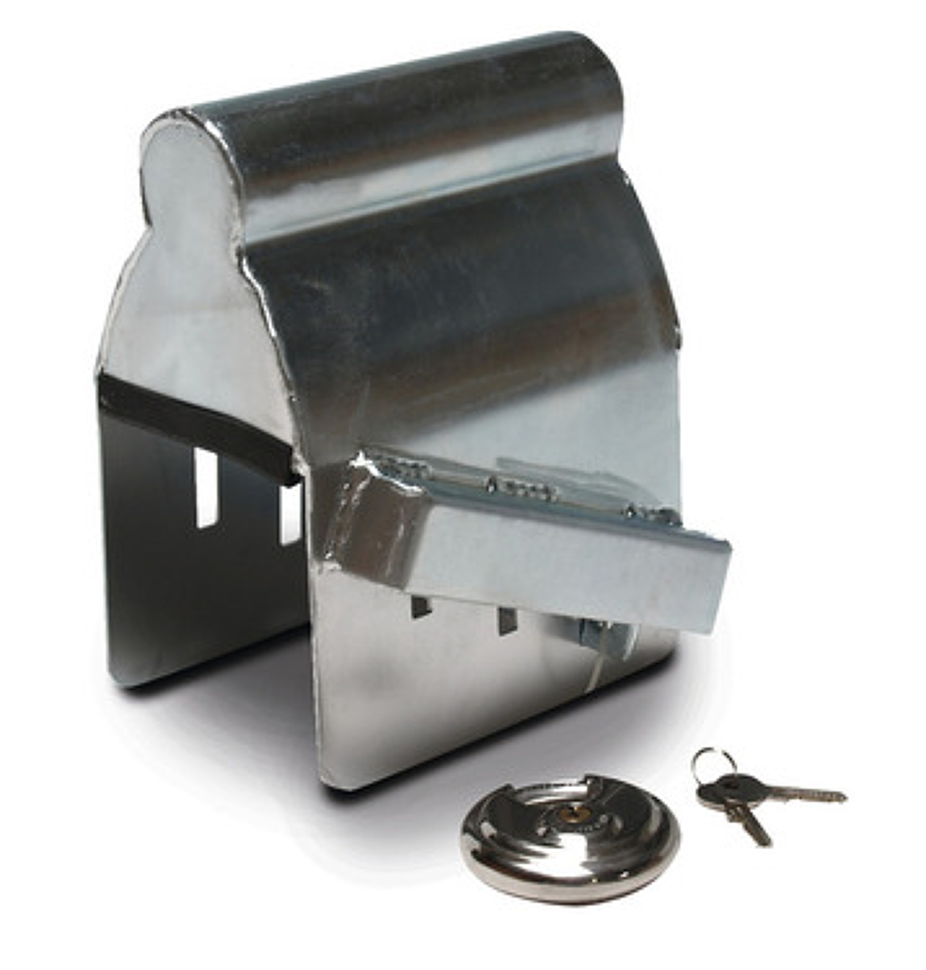 Zámek skříně pro připojený karavan nebo přívěs. Robustní kryt z ocelového plechu s bezpečnostním zámkem a 2 klíči.