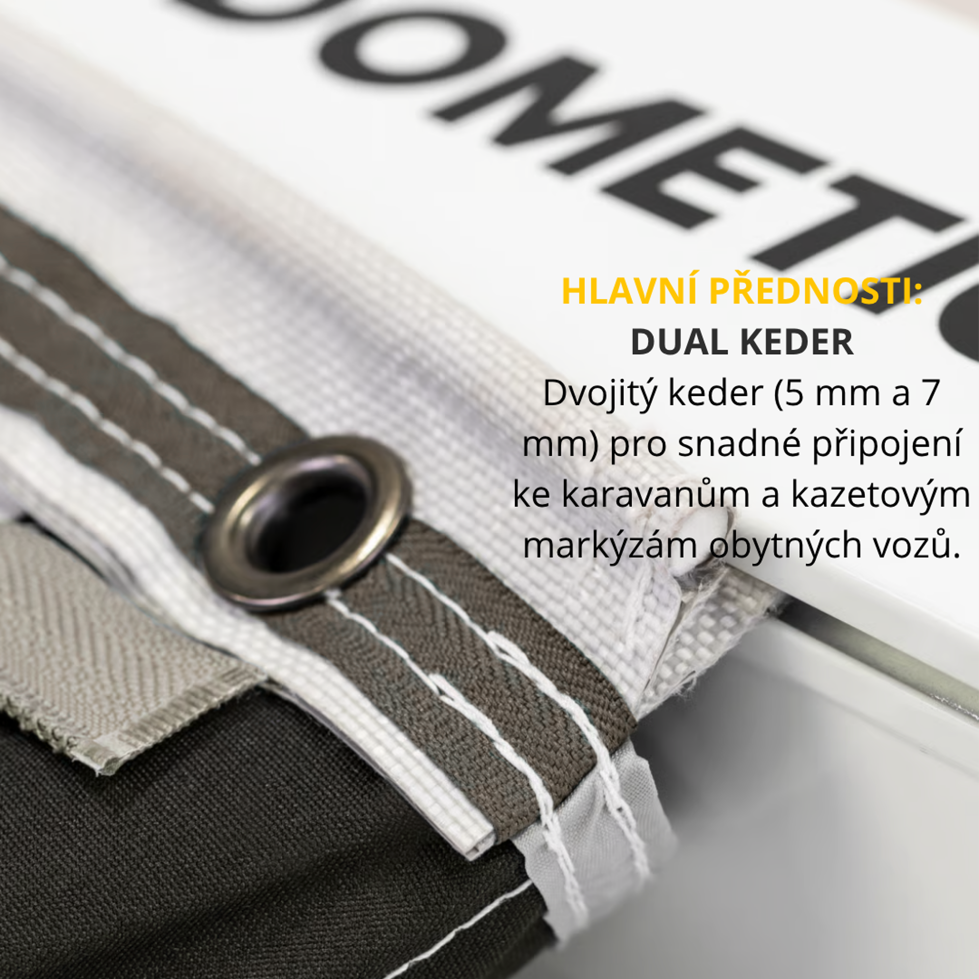 Dual Keder systém (5 mm a 7 mm) zaručuje kompatibilitu s většinou kazetových markýz obytných vozů, takže ho připojíte bez složitých úprav.